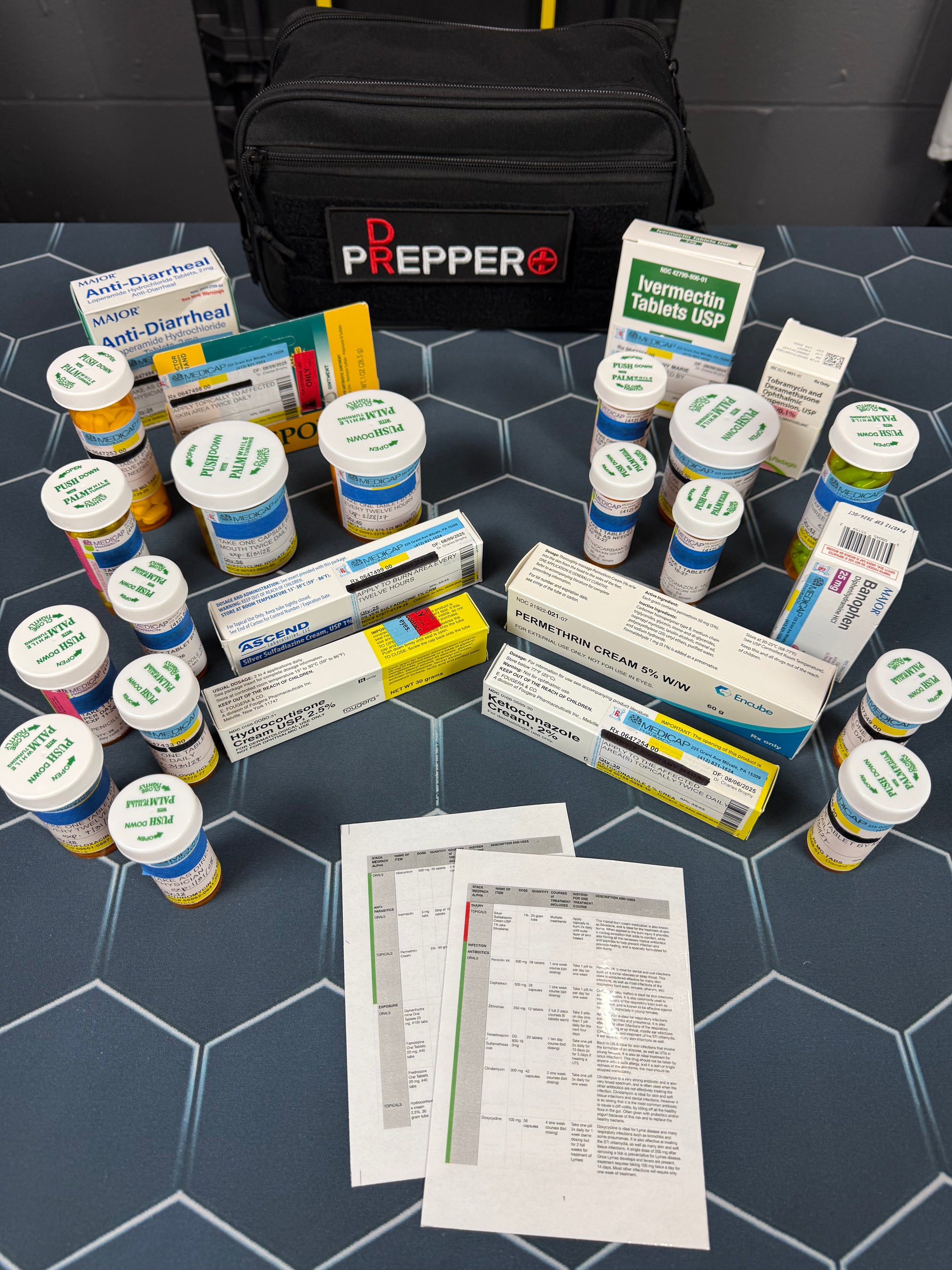 The STACK MedPack ALPHA is a comprehensive supply of medications that are ideal for preppers to have on hand in case of emergencies. There are 9 different courses of antibiotics, with repeat courses of the most important 5. There are also antivirals, antifungals, and antiparasitis that include the difficult to obtain Ivermectin. Additional medications cover for exposure related illnesses such as allergic reactions, as well as general medications for pain, n/v/d, and more. A 4x6 laminated insert helps instruct preppers on medication dosing and the types of conditions that tend to respond well to that medication.