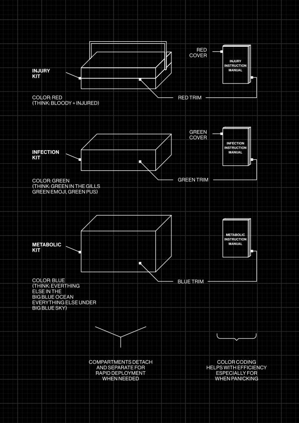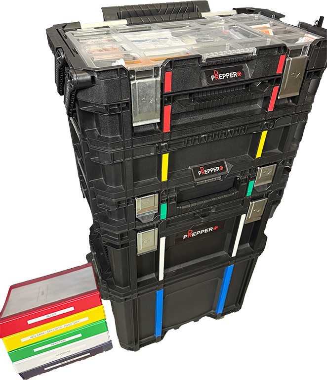 Each module contains all the items needed for that specific category of medical emergency, and can be easily disconnected and carried to a difficult-to-reach site. Color coding between the kit (containing the supplies) and the binder (containing the education/instruction) allows preppers to quickly and efficiently access what is needed to solve the problem.