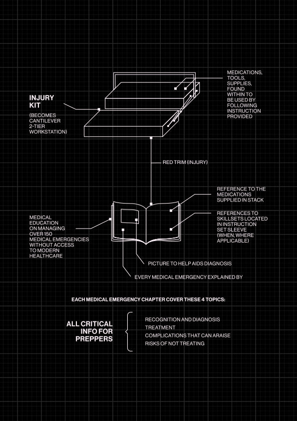 The kits and the binders are designed to seamlessly work together. Education is provided on each medical emergency, and throughout each topic the prepper is given references to skillsets and medications (all provided in the S.T.A.C.K. tower) that help solve that problem.